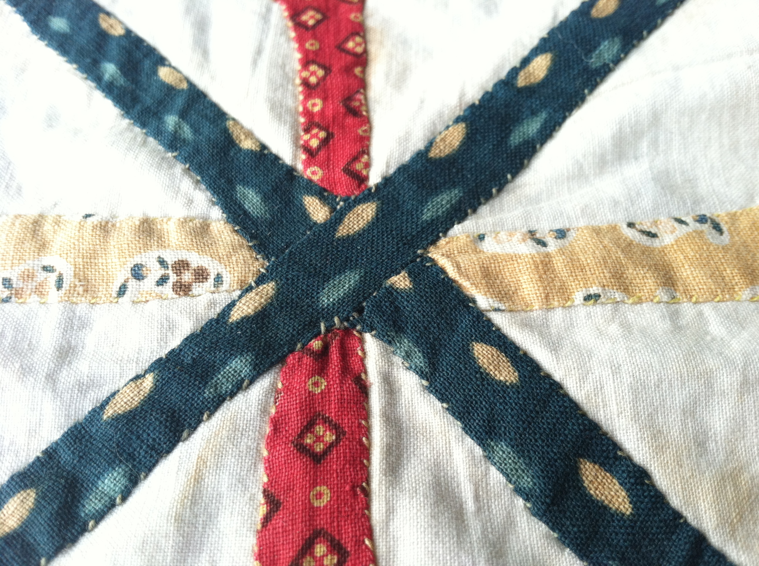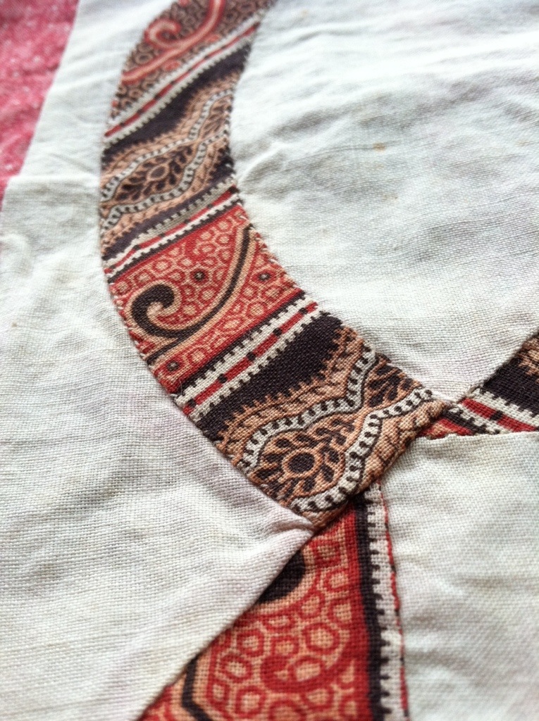In the detail above you can see that more than one color of thread was used. A green for the darkest fabric and white for just about everything else. The seams are also hand-pieced, using 1/8″ seams.
