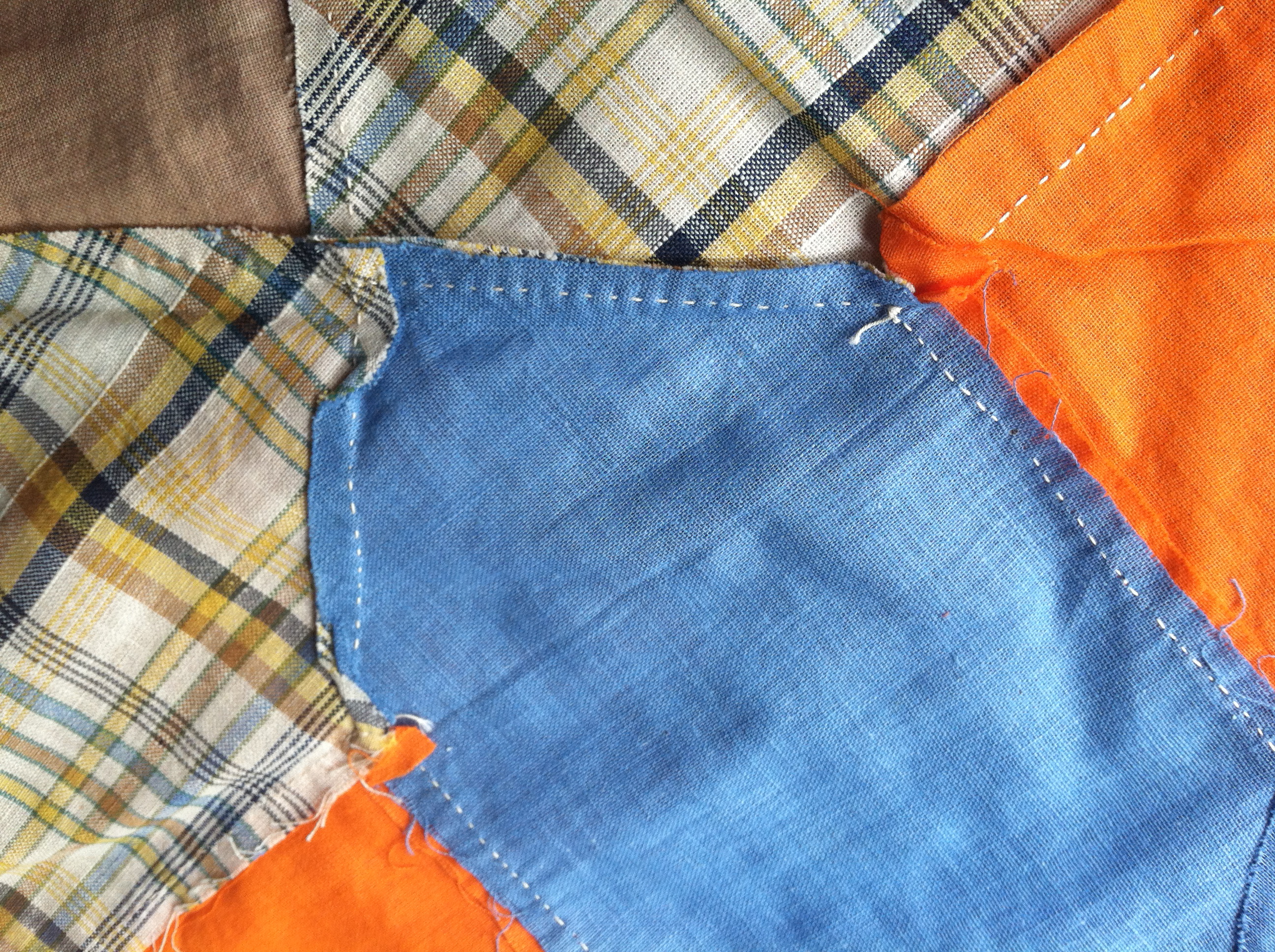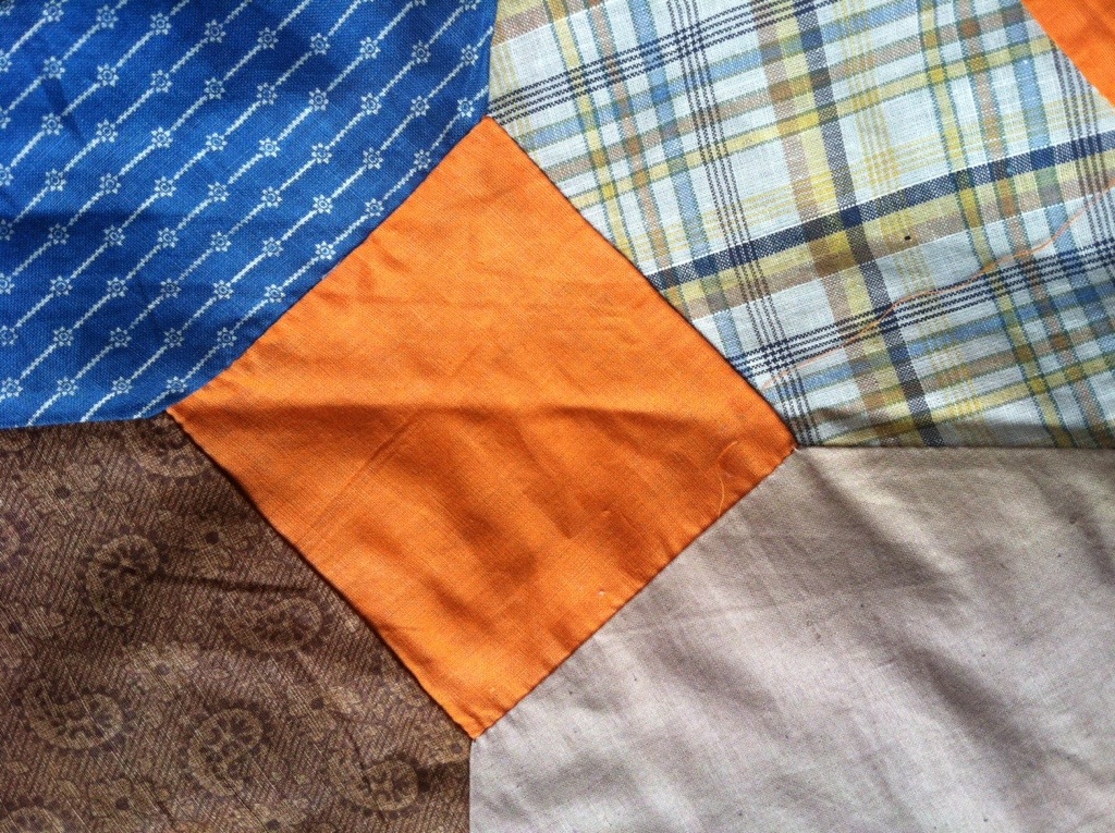 Marking seams in patchwork quilts is almost universal for hand sewing these days. The prints are a mix of solids, plaids, checks, and indigos. Kind of funky, not super-exciting fabric wise. But that orange – the orange makes the quilt top nearly vibrate in intensity.