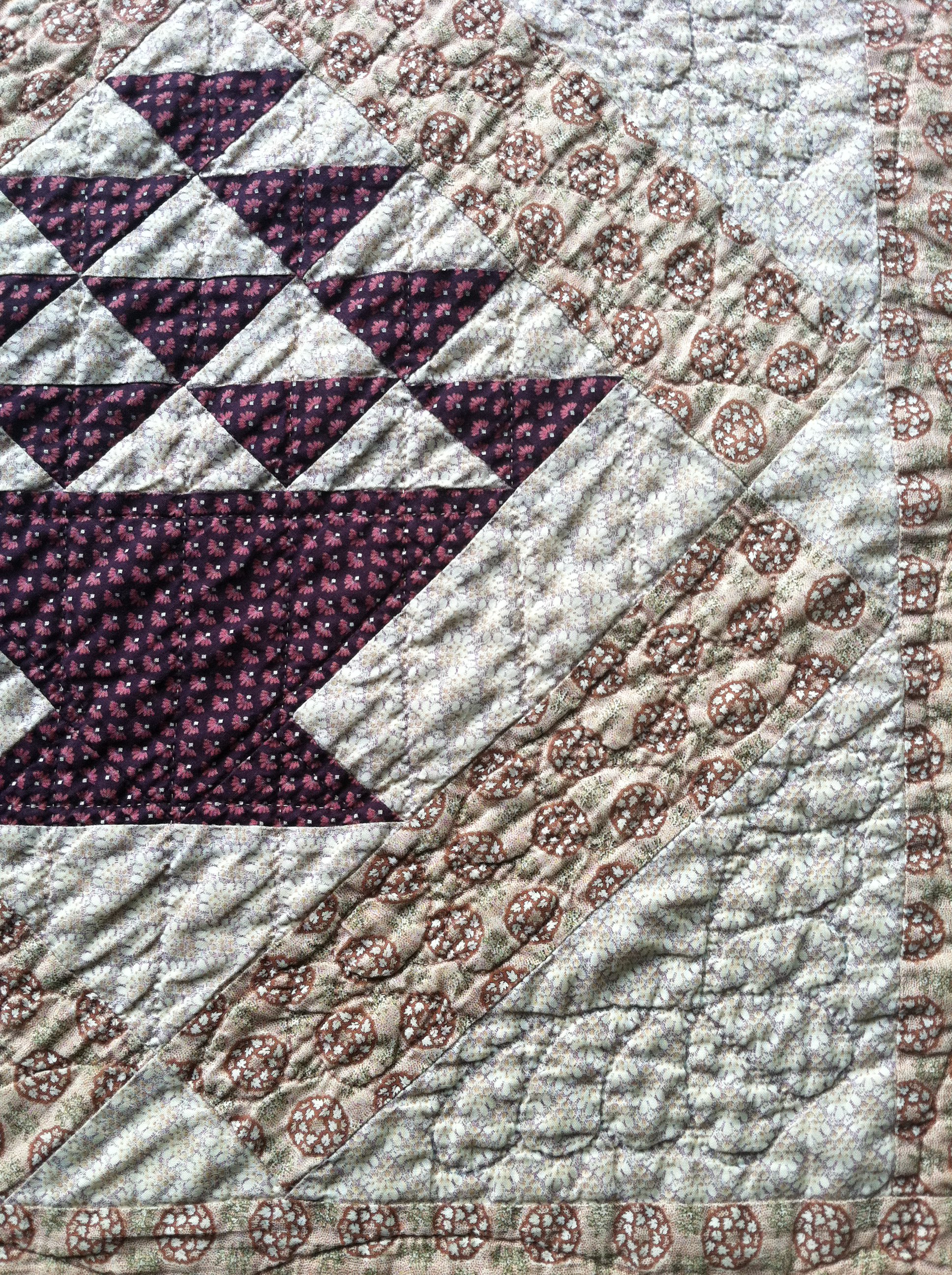 At the time I made it, this was my idea of a reproduction quilt – I used mostly (but not all) “authentic reproduction” fabrics and wanted something old-fashioned looking. To me, that meant heavily hand quilted. If you look at the corner triangle, above, there’s an elaborate feathered corner motif – a stencil was used for that. As I recall, the quilt was basted and partially marked by the Mennonite ladies who were friends of mine. When I took it home to quilt it, I did have some decisions left to make for quilting designs, and that was when I fell down a certain rabbit hole.