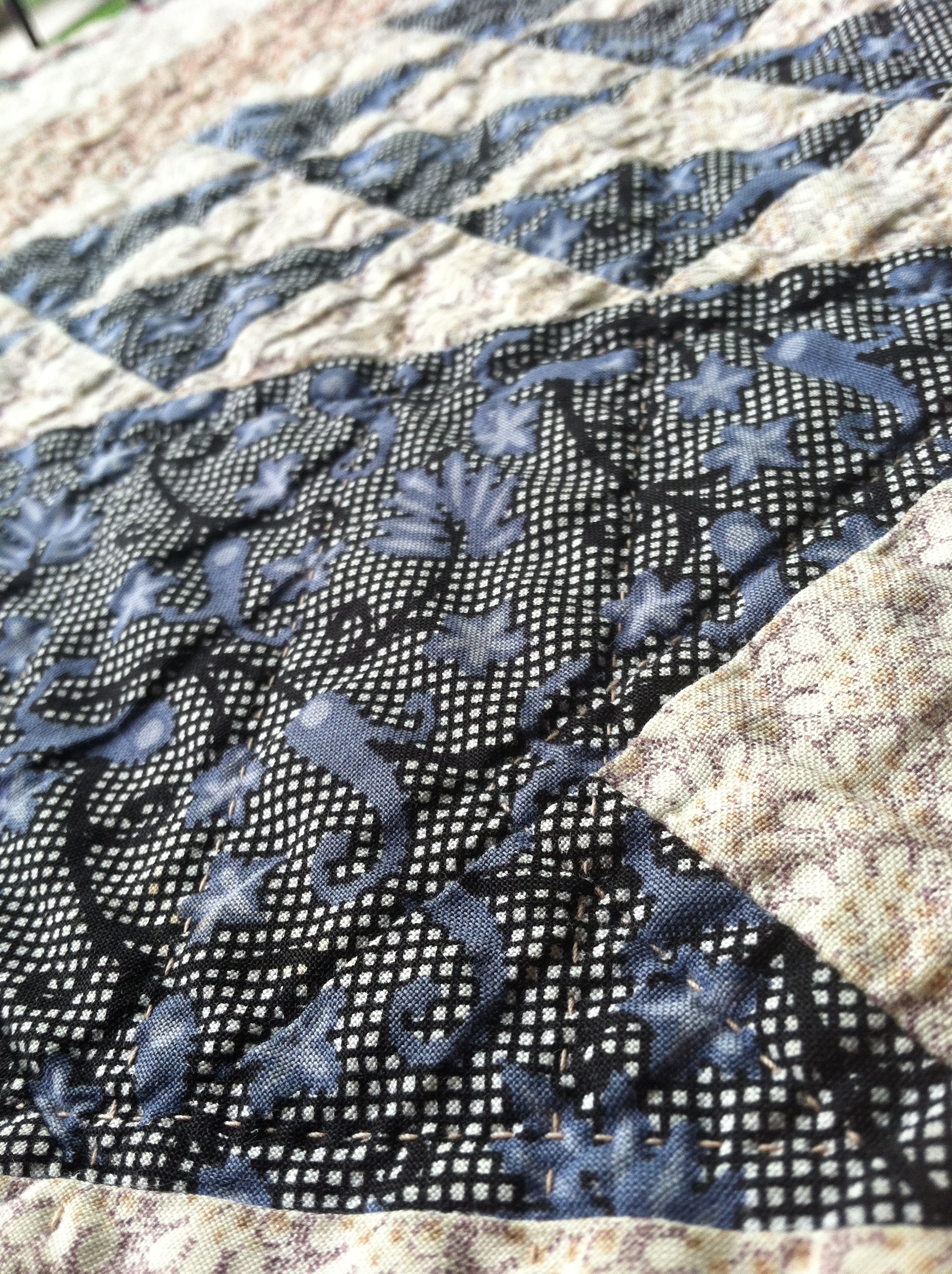 Welsh quilts, antique Welsh quilts, were the single thing that cured me (yes, I’m being biased) of my striving for perfection. In my hand quilting, in my fiber endeavors in general. These days, I think most of us are familiar with the concept of wabi sabi – acceptance of transience and imperfection. But it took me years of battling with myself to figure out that “perfection” – perfect stitches, perfect symmetry – weren’t what I liked at all.