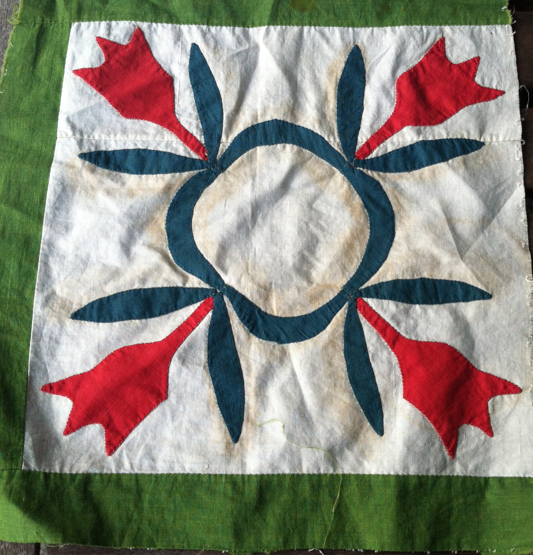 The reel and tulips block is the only one with the solid blue fabric. You may notice that there’s a bit of yellow/brown staining all around the blue. I’ve been told that there was a time period when a certain green was available that often lost it’s yellow over-dye. The solid blue here may once have been green. That particular blue (more on that in another post) may date from the 1850s, although I can’t really date the applique piece only by the inclusion of that fabric.