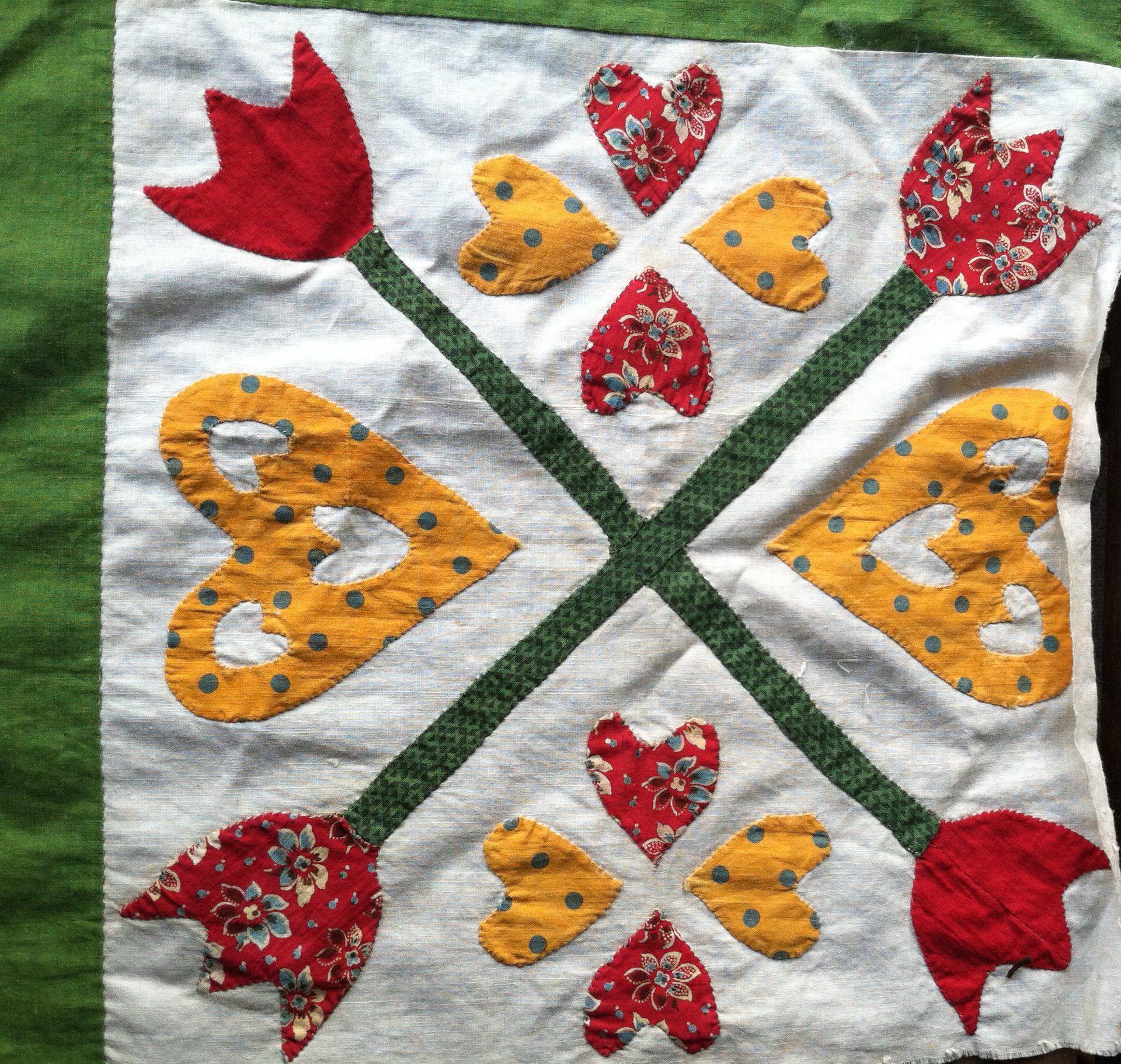 The intersection of the reel pieces, the leaves, and the tulip stems is pretty imperfect. Imperfect, but it works. These days, if you entered a quilt like that in a show, you wouldn’t get top marks for technique. Thankfully, this seamstress wasn’t concerned with things like that.