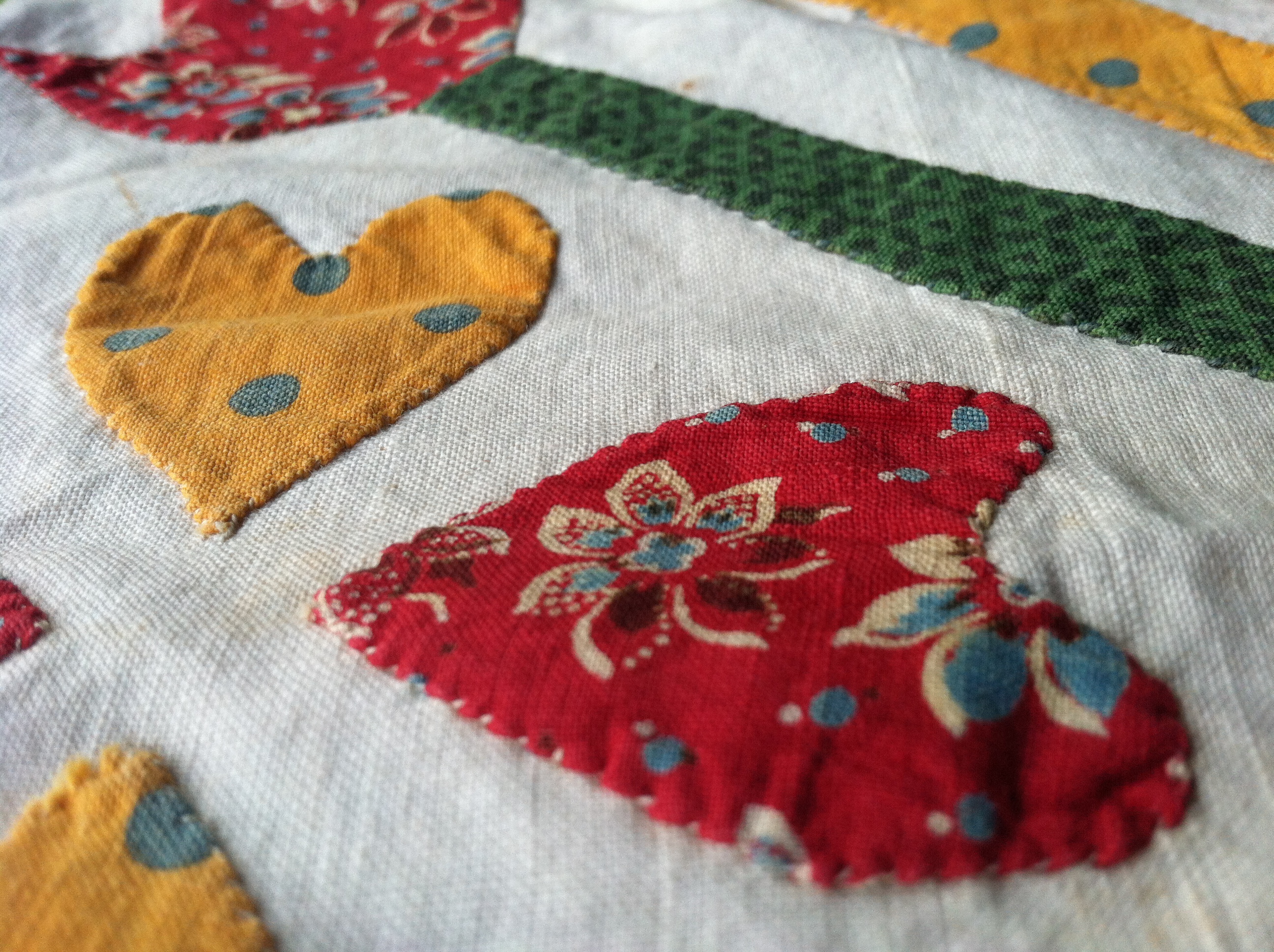 This is a fragment of an applique quilt top that I bought from quilt dealer Mary Koval many years ago. My original interest in applique started when I saw a show-stopping Baltimore Album quilt at the Folk Art Museum here in New York. I taught myself to applique because I wanted to be able to replicate that intricacy and perfection. As time went on, though, I found that I really loved the funkier, less-than-perfect quilts even more.